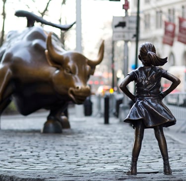 "Fearless girl" standing up to the bull on Wall Street, New York.